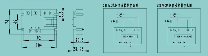 注:①②為輸出端,即梭塊內部可控硅的兩個極,無極性要求:半波輸出模塊內部,單相可控硅的陽極接①,陰極接② 端。③④為模塊內部同步變壓器初級,有220VAC和380VAC兩種規格;220VAC檔的輸入電壓為165VAC-260VAC; 380VAC檔的輸入電壓為285VAC-420VAC; ③④無極性要求。COM為模塊內部地,CON為控制端,+5V為內部輸出輔助電 源,只供電位器手動調節控制時用。①②③④的強電部分和+5V、CON、COM的弱電控制信號端全隔離。直流5A以上需加散熱器10A以上需加風冷或水冷,檔選取外接控制信號時,CON接正,COM接負;如極性相反則輸出端失控(全開或全)。